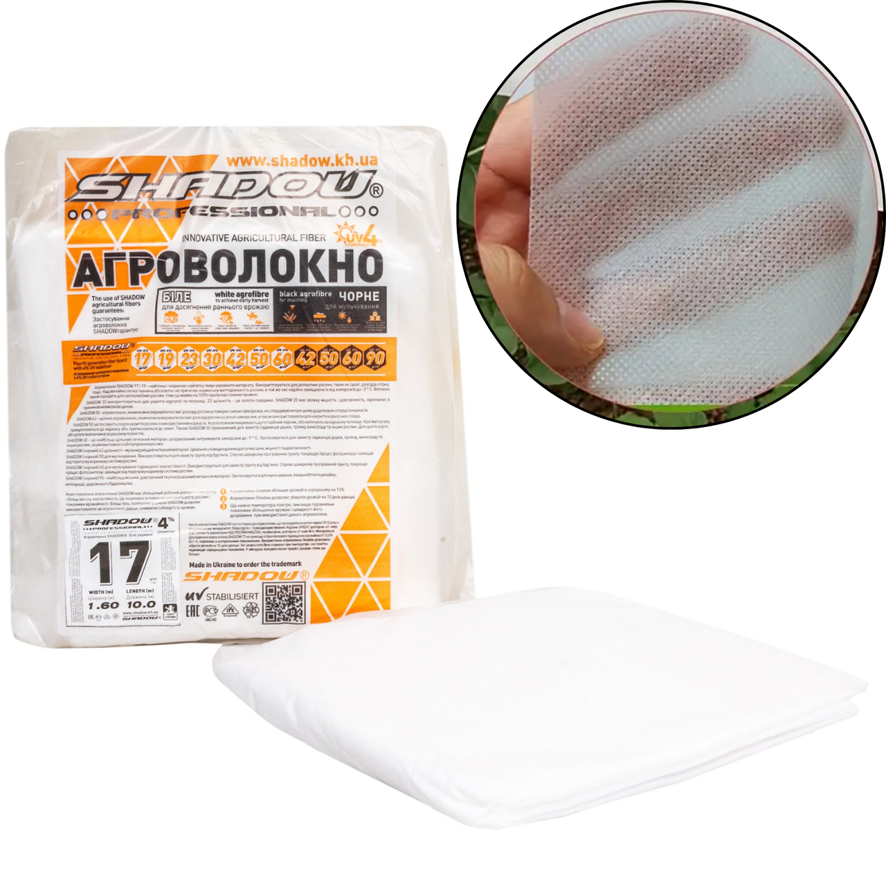 ТМ "Shadow" пропонує біле агроволокно на метраж щільністю 17 г/м2, ширина відрізу 1.6, а довжина його 10 метрів, що дуже зручно та вигідно для невеликих ділянок.